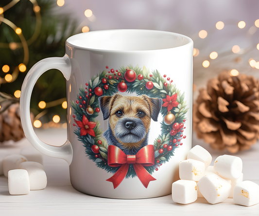 Personalised Blue and Tan Border Terrier Dog Christmas Wreath Gift Mug