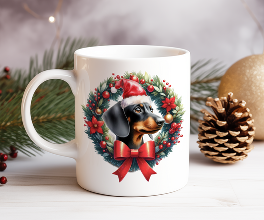 Personalised Black and Tan Dachshund Dog Christmas Wreath Gift Mug