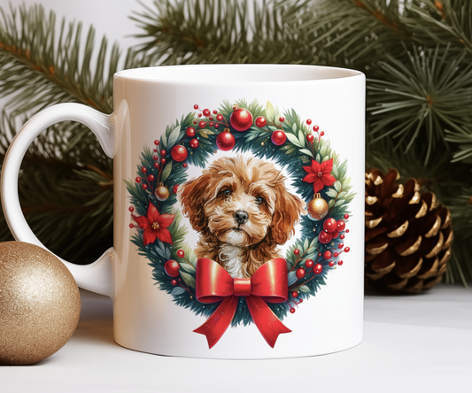 Personalised Chocolate Cockapoo Dog Christmas Wreath Gift Mug