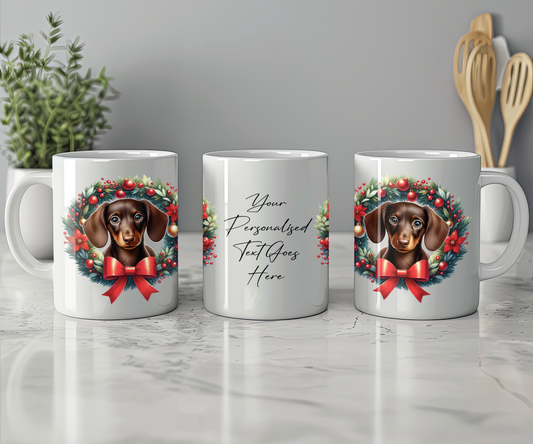 Personalised Chocolate Dachshund Dog Christmas Wreath Gift Mug