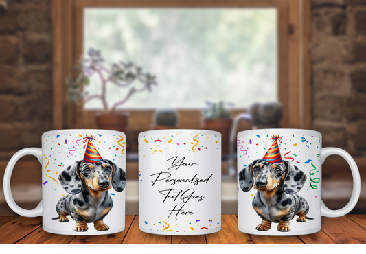 Personalised Dog Gift Mug - Dappled Chocolate Dachshund with Birthday Congratulations Party Hat