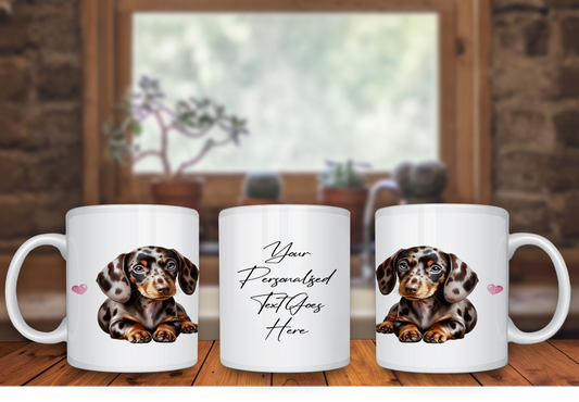 Personalised Dog Gift Mug - Dappled Chocolate Dachshund with Custom Message and Optional Hearts