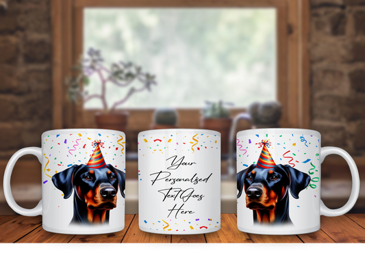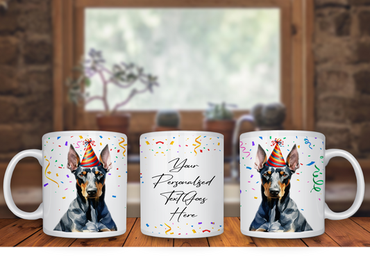 Personalised Dog Gift Mug - Doberman with Birthday Congratulations Party Hat B
