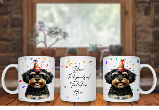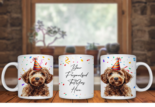 Personalised Dog Gift Mug - Labradoodle with Birthday Congratulations Party Hat