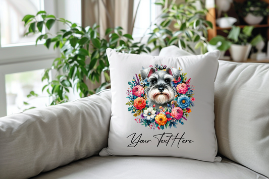 Personalised Miniature Schnauzer - Floral Summer Dog Wreath Keepsake Gift Cushion