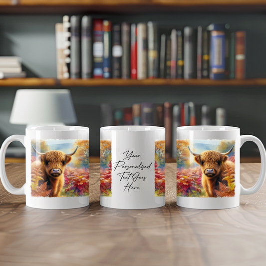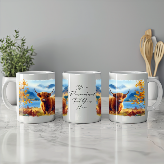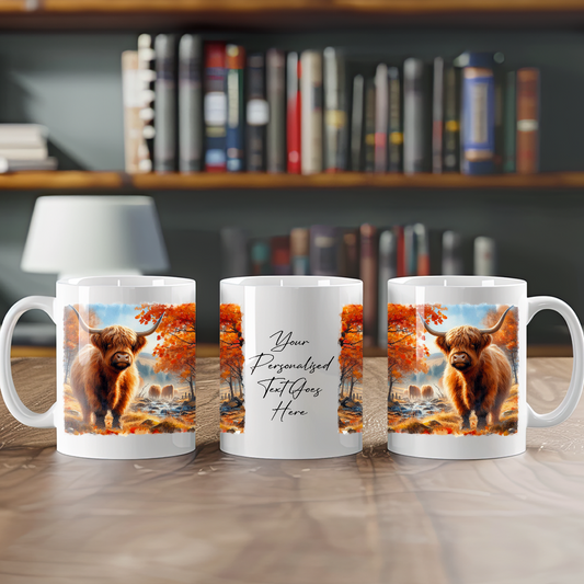Highland Cow in an Autumn Scene Personalised Gift Mug E