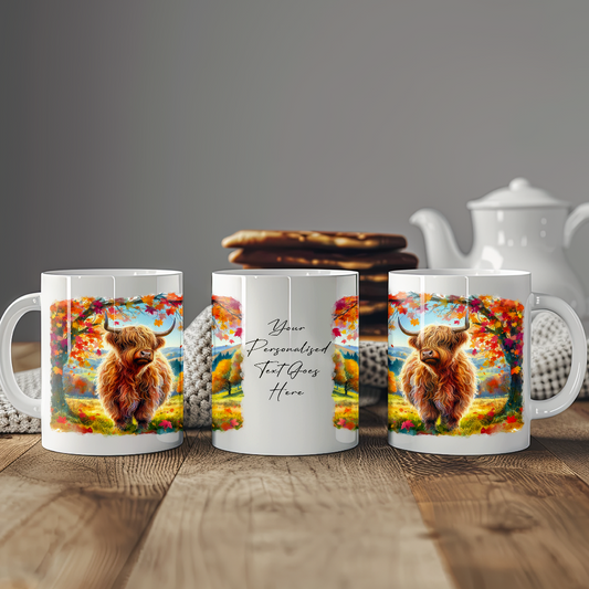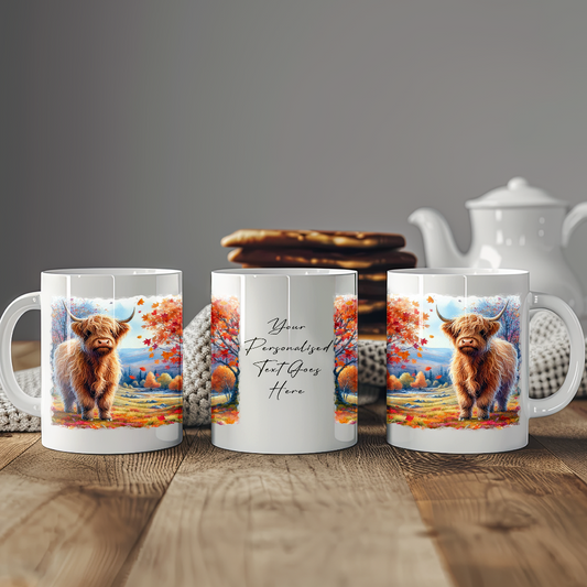 Highland Cow in an Autumn Scene Personalised Gift Mug A
