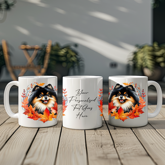 Black and Tan Pomeranian in an Autumn Wreath Personalised Dog Gift Mug