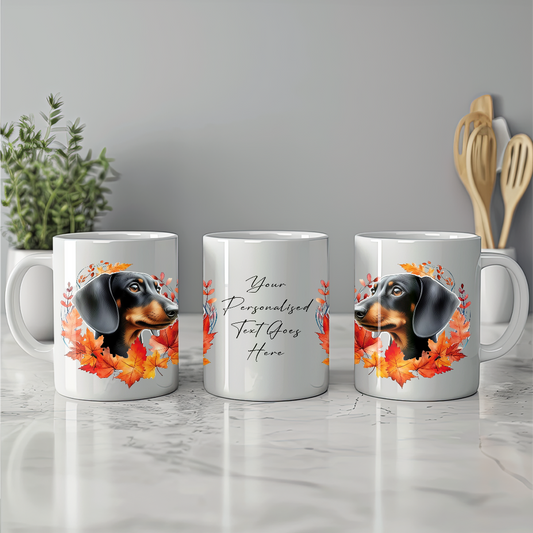 Black and Tan Dachshund in an Autumn Wreath Personalised Dog Gift Mug
