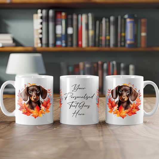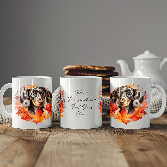 Dappled Chocolate Dachshund in an Autumn Wreath Personalised Dog Gift Mug