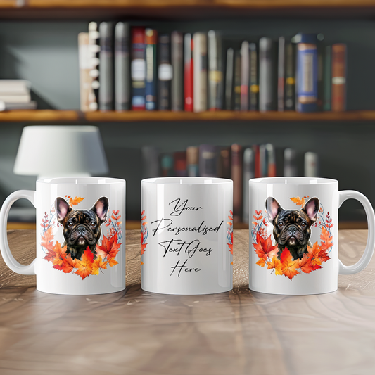 Brindle French Bulldog in an Autumn Wreath Personalised Dog Gift Mug