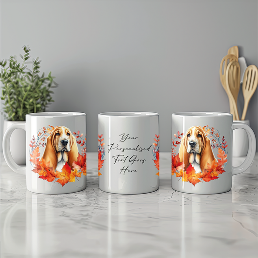 Basset Hound in an Autumn Wreath Personalised Dog Gift Mug
