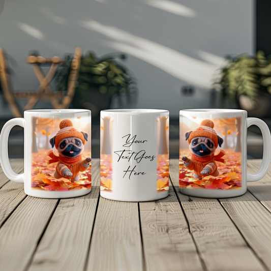Personalised Pug Playing in Autumn Leaves Gift Mug