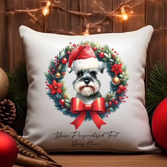 Personalised Schnauzer with Santa Hat Christmas Dog Wreath Gift Cushion