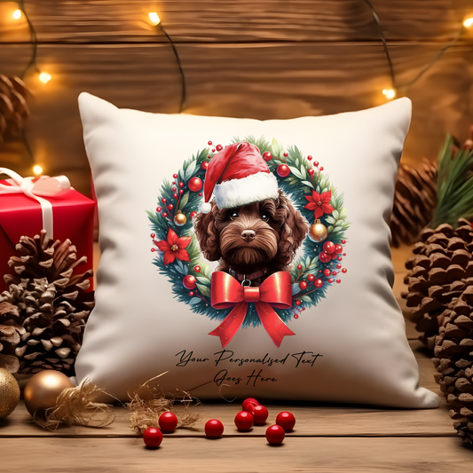 Personalised Chocolate Cockapoo with Santa Hat Christmas Dog Wreath Gift Cushion